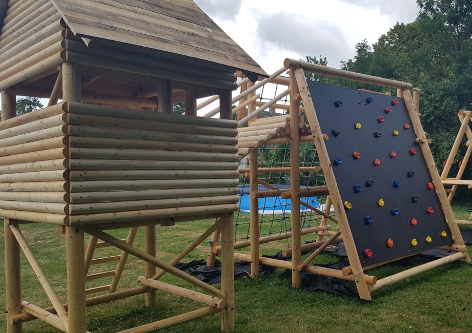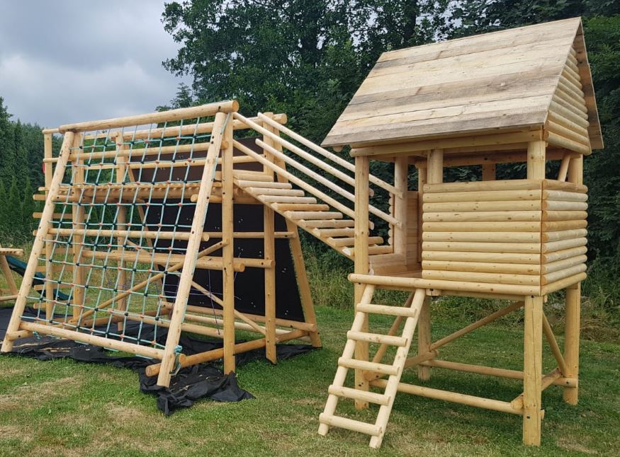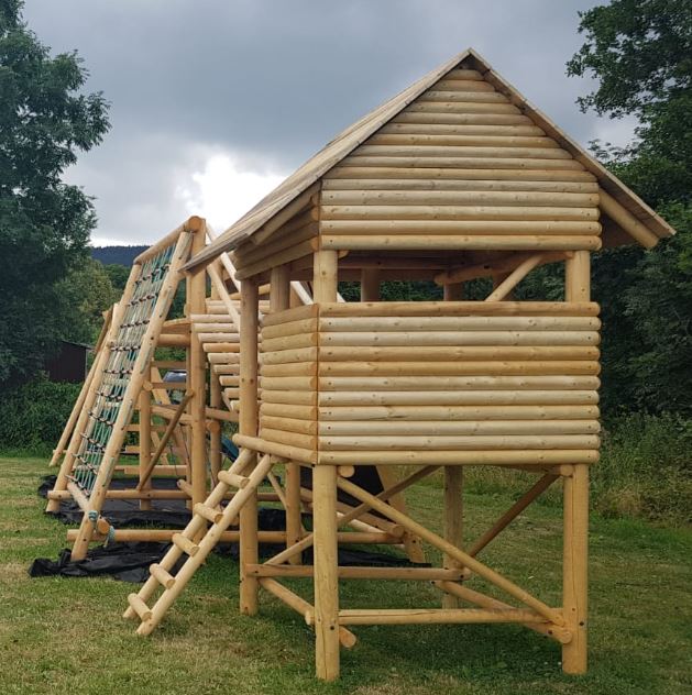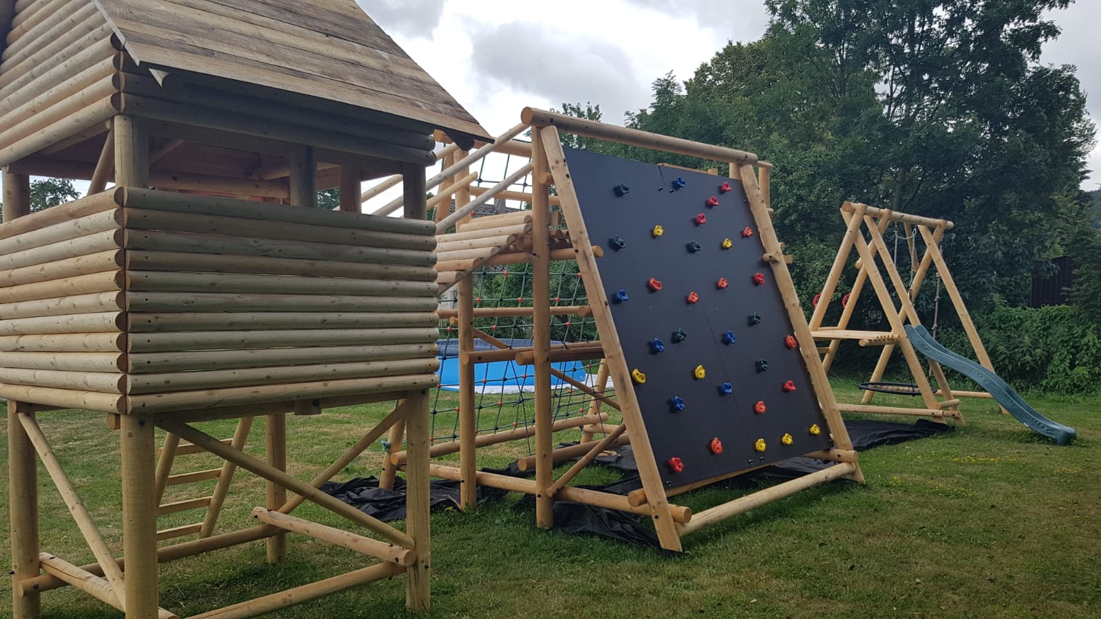 Nová zahradní sestava neobsahuje houpačku, skluzavku, šplhací lano a další klasické prvky. Jedná se o multifunkční sestavu pro děti i dospělé včetně tolik oblíbného dětského domečku. Sestava napomáhá zlepšit motoriku, balanční schopnosti, odbourává strach z výšek, posiluje sebevědomí a zabaví na dlouhý čas a navíc je propojena s herním domečkem. Vše vyrobeno z mixu masivních frézovaných smrkových kuláčů o průměru 6, 8, 10, 12 cm. Obsahuje 2,5 x 2,5 m lezecké stěny s 32 chyty, 2,5 x 2,5 m lezecké sítě, balanční kladinu, nástupní žebřík pro vstup, rovný žebřík v horní partii pro výlez ze sítě nebo lezecké stěny a dále pak žebřík z domečku. Jednotlivé prvky jsou o minimální nosnosti 150 kg (chyty lezecké stěny a šplhací síť). Všechny spoje jsou řešeny pozinkovanými šrouby třídy 8.8 a závitovými tyčemi, matky jsou kryty plastovými krytkami. Montáž půlkuláčů na žebříky je řešena pozinkovanými vruty. Cena výše uvedené sestavy je komplet 62990,-Kč. Doprava po celé ČR a montáž dle případné dohody, kterou rozhodně doporučujeme.