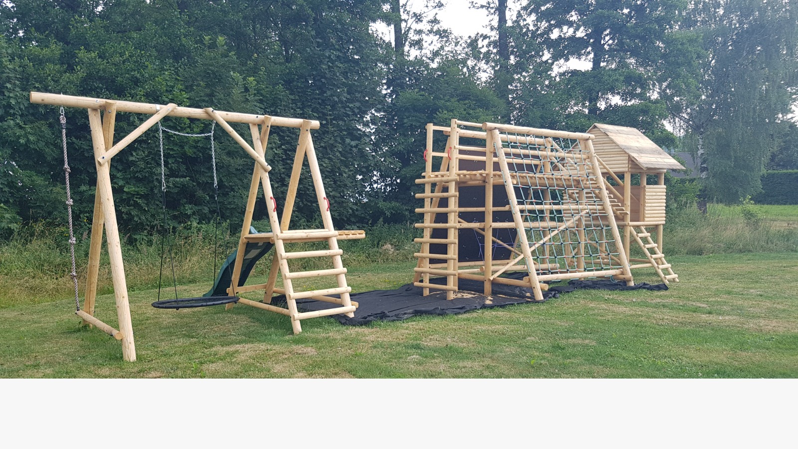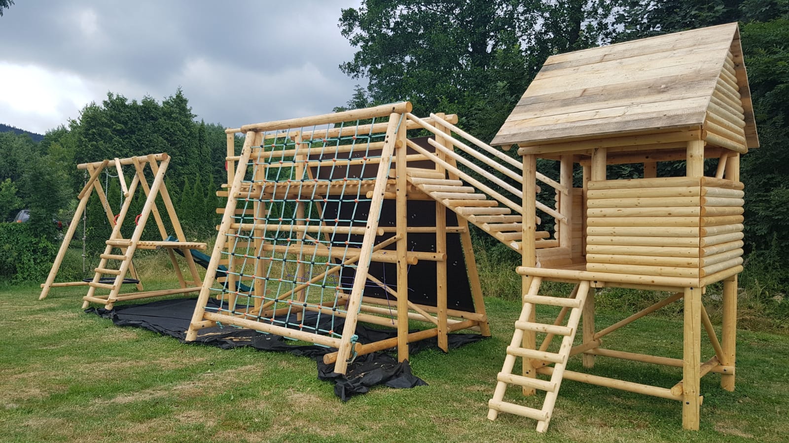 Nová zahradní multifunkční sestava obsahuje tradiční prvky jako houpačku, skluzavku, šplhací lano a dále inovativní prvky pro děti i dospělé, které napomáhají zlepšit motoriku, balanční schopnosti, odbourávají strach z výšek, posiluje sebevědomí a zabaví na dlouhý čas a navíc je propojena s herním domečkem. Vše vyrobeno z mixu masivních frézovaných smrkových kuláčů o průměru 6, 8, 10, 12 cm. Obsahuje 2,5 x 2,5 m lezecké stěny s chyty, 2,5 x 2,5 m lezecké sítě, balanční kladinu, nástupní žebřík, rovný žebřík v horní partii pro výlez ze sítě nebo lezecké stěny a dále pak žebřík z domečku. Jednotlivé prvky jsou o minimální nosnosti 150 kg (chyty lezecké stěny a šplhací síť). Všechny spoje jsou řešeny pozinkovanými štrouby pevnosti 8.8 a závitovými tyčemi, matky jsou kryty plastovými krytkami. Montáž půlkuláčů na žebříky je řešena pozinkovanými vruty. Cena výše uvedené kompletní multifunkční sestavy za komplet (včetně skluzavky a čapího hnízda a boulderu a šplhací sítě) je 89990,-Kč. Doprava po celé ČR a montáž dle případné dohody. Montáž zásadně doporučujeme.